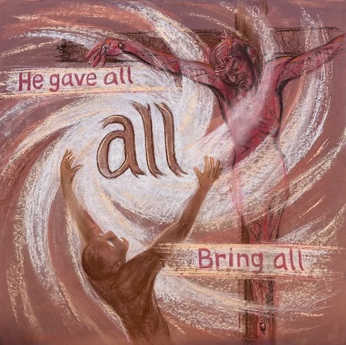 ‘Club Chapel Art’ evolved through my passion to teaching important lessons in the exercise of visualizing the main scripture point into a drawing. On the dry eraser board we would sketch out all our ideas while design in the moment…composition, form, style and color notes. I have to admit 85% of the artwork was from my help, with the students mostly coloring in forms I sketched. We used soft pastels on 3’ square tone paper which was design for speedy turnaround, and clear, visual large impact. Drawing in front of the whole school, having only about 45 minutes to complete created this raw loose style. Eventually, a few of the students were able to design and draw their own concepts. Those were my top students that went through my program all the way to AP classes and then got scholarships to great colleges.
